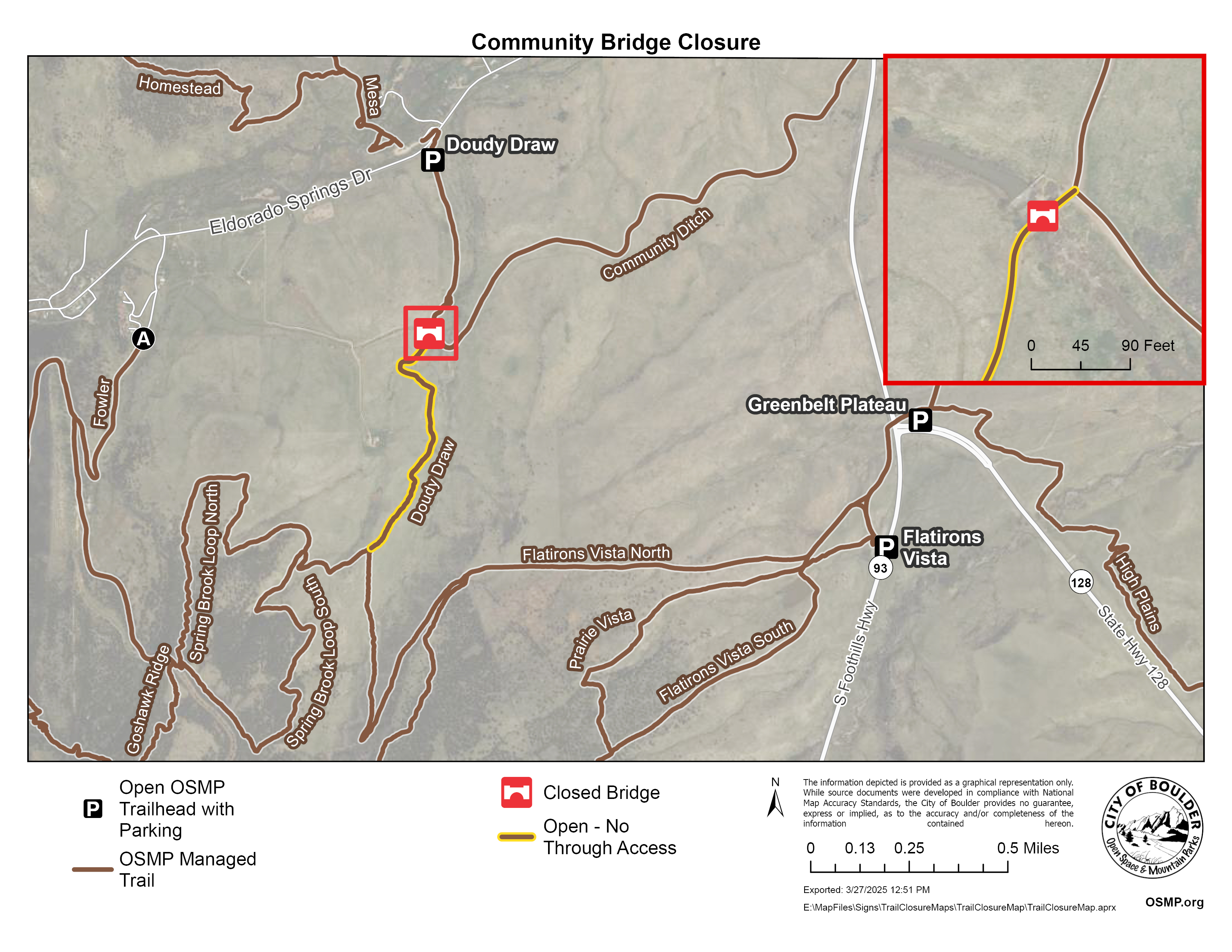 - Closure Area: The Doudy Draw Trail bridge over Community Ditch will be closed and prevent access to trails south of the bridge, such as Spring Brook Loop and Flatirons Vista trails. View a map of the closure area below or download a JPEG image.