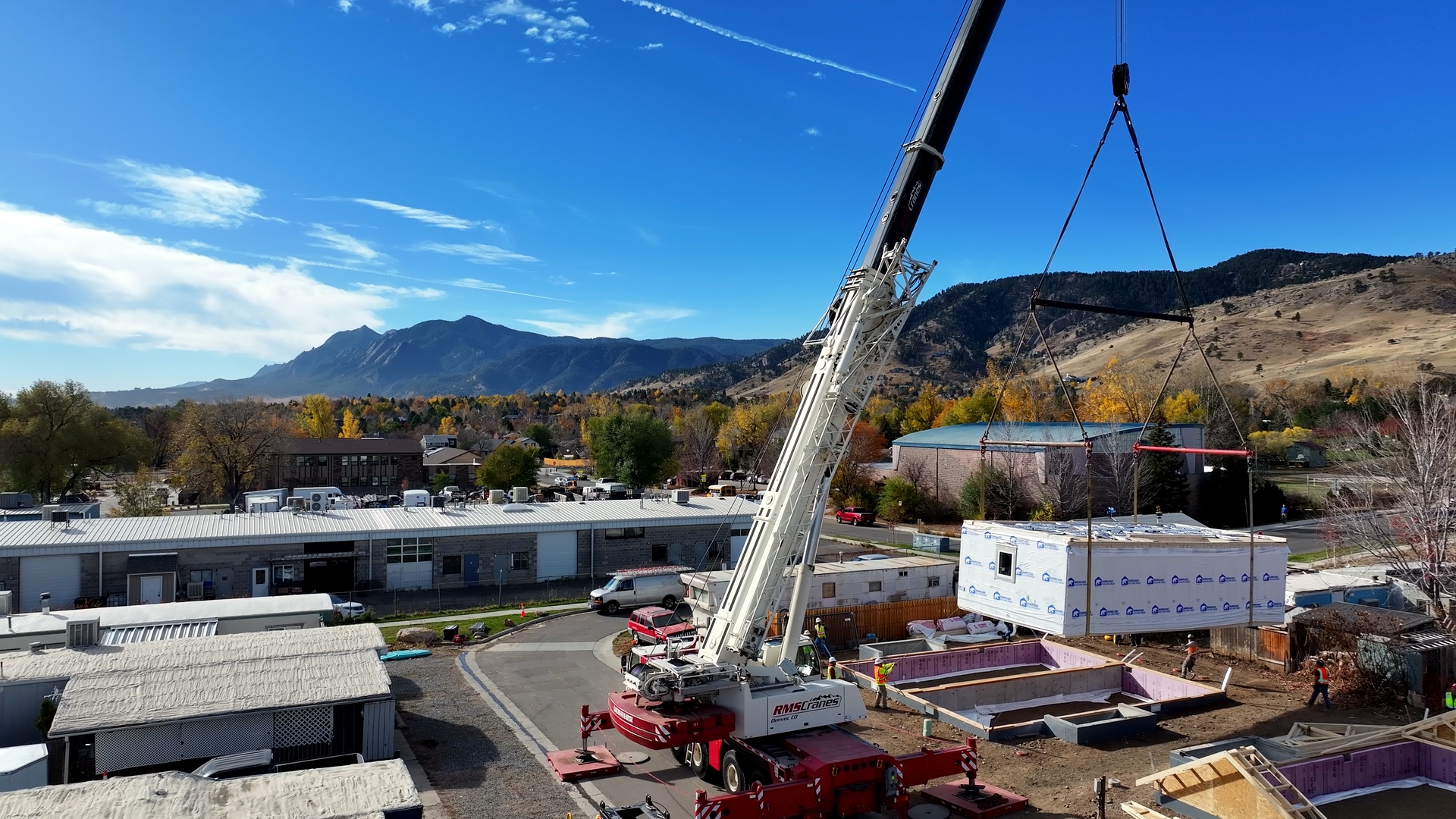 On Nov. 4, 2025, the first BoulderMOD duplex made its way from the factory floor to its permanent foundation at the Ponderosa community in North Boulder. This marks a major milestone for both BoulderMOD and the city’s ongoing commitment to ensuring that families and individuals have safe and affordable places to live in Boulder.