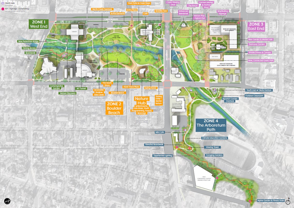 This will be a space for everyone - a lively and distinct destination that reflects the principles laid on in the 2015 Civic Area plan. A place where people of all ages, abilities, backgrounds, and incomes feel welcome to recreate, socialize, relax, and enjoy the ambiance of a high-altitude urban center at the feet of the Rocky Mountains. The green ribbon along Boulder Creek is the unifying design that will weave metropolitan and park space into a richly diverse, sustainable, equitable, resilient, communal, recreational, artistic, historic, cultural, educational, and social gathering space that reflects Boulder’s identity as a funky, fun and friendly place to live.