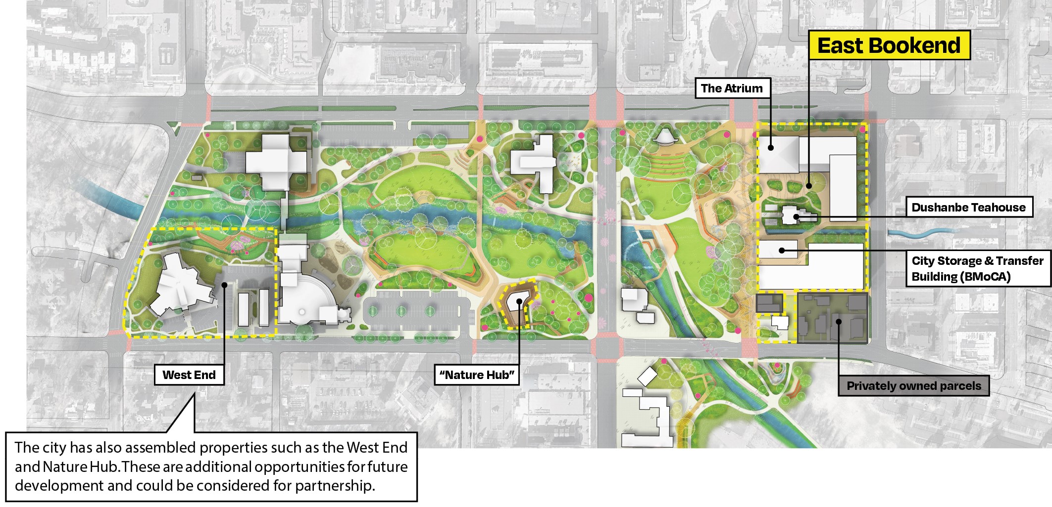 To achieve its bold goals, the city is seeking an equally bold, innovative and experienced partner(s) to help refine the vision and build, operate and activate new buildings and spaces in the East Bookend (along with other potential opportunities on city properties in the immediate area, such as the West Bookend and Nature Hub) through various avenues of purchasing property and lease agreements.