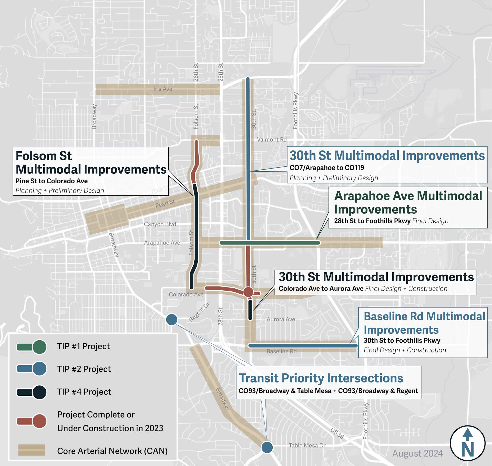 This is a text alternative to the map. A map of Boulder that shows completed, under construction, and upcoming Transportation Improvements Program (TIP) projects. TIP funds are categorized into four funding rounds, or calls. Call 1 is slated for 2022-2025 and includes the final design for the Arapahoe Avenue Multimodal Improvements project (28th Street to Foothills Parkway). Call 2 is slated for 2022-2025 and includes the planning and preliminary design for the 30th Street Multimodal Improvements project (CO 7/Arapahoe Avenue to CO 119/Diagonal Highway), final design and construction for the Baseline Road Multimodal Improvements project (30th Street to Foothills Parkway), and Transit Priority Intersection projects at Broadway/Table Mesa Drive and Broadway/Regent Drive. Call 4 is slated for 2024-2027 and includes the final design and construction for the 30th Street Multimodal Improvements (Colorado Avenue to Aurora Avenue) and the planning and preliminary design for the Folsom Street Multimodal Improvements project (Pine Street to Colorado Avenue). Projects completed or under construction in 2023 include the Folsom Street Multimodal Improvements project (Valmont Road to Pine Street), 30th Street Multimodal Improvements project (Arapahoe Avenue to Colorado Avenue), 30th Street and Colorado Avenue Protected Intersection and Underpass project, and 28th Street and Colorado Avenue Protected Intersection Improvements project (Regent Drive to west of 30th Street). Core Arterial Network corridors are also highlighted on the map. These corridors include Broadway from Regent Drive to Table Mesa Drive, Baseline Road from 28th Street to Foothills Parkway, 30th Street from Baseline Road to Diagonal Highway, Colorado Avenue from Folsom Street to 33rd Street, Arapahoe Avenue from Folsom Street to 63rd Street, Pearl Street from 19th Street to 30th Street, Folsom Street from Pine Street to Colorado Avenue, Iris Avenue from Broadway to 28th Street, Valmont Road from 28th Street to Folsom Street, and the Downtown Study.