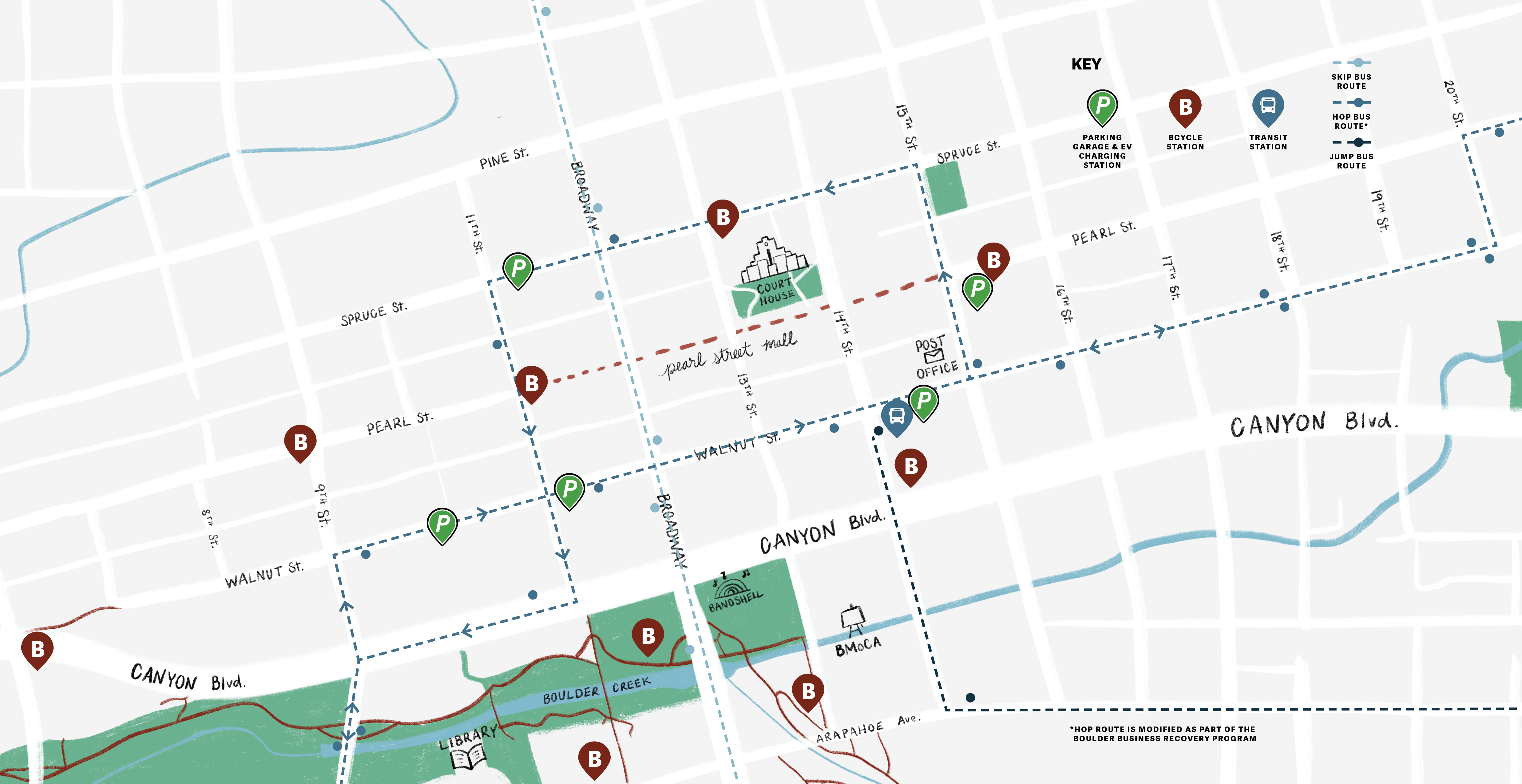 Map showing Downtown Boulder parking garages, EV charging stations, bus routes and transit stations, and Bcycle stations. For better legibility, open a larger map in a new window.