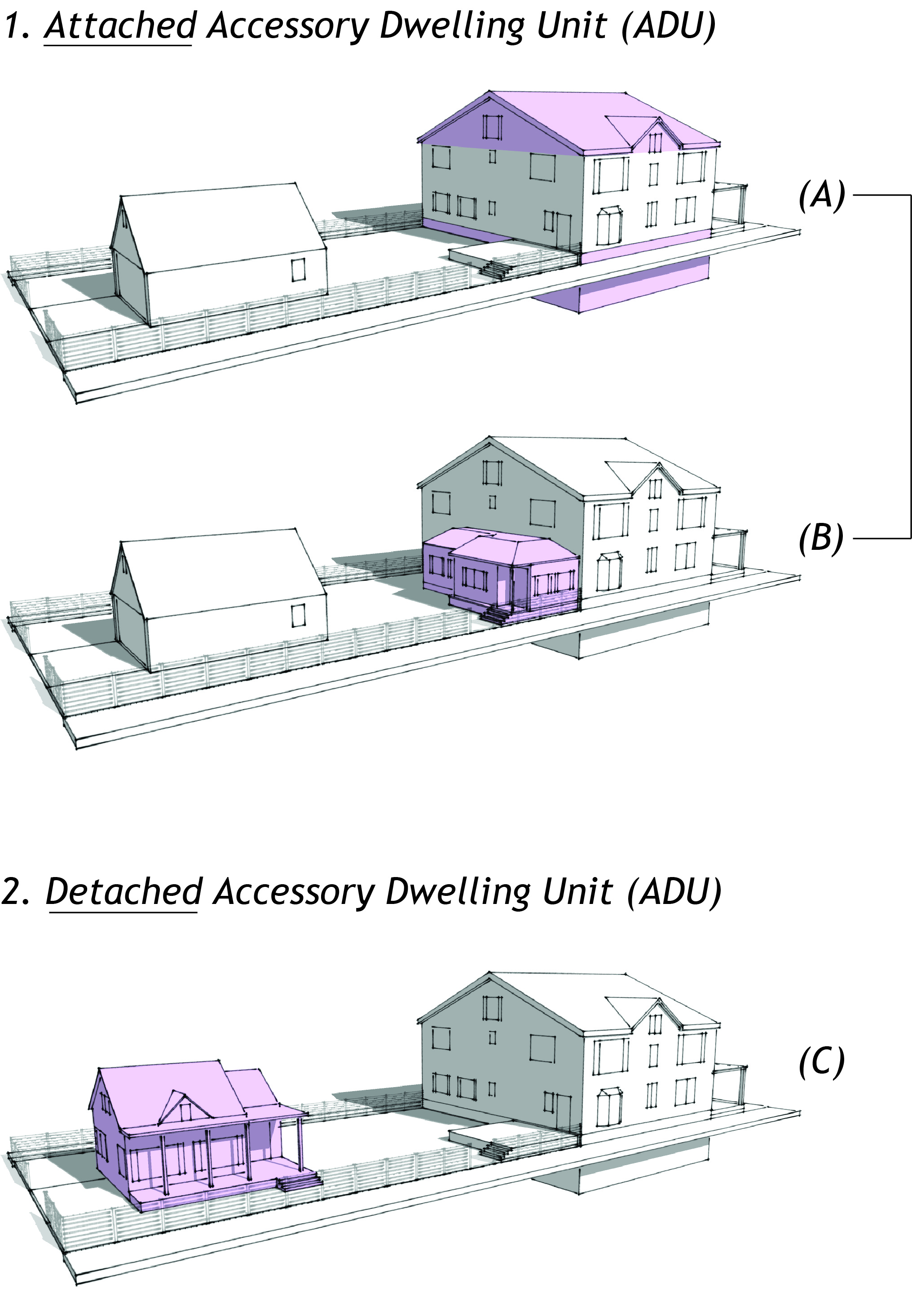 An ADU is an additional dwelling unit that has separate kitchen, sleeping and bathroom facilities. It can be attached or detached from the principal dwelling unit on a lot. An ADU is permitted only if it meets the requirements of Section 9.6.3(n) of the land use code.