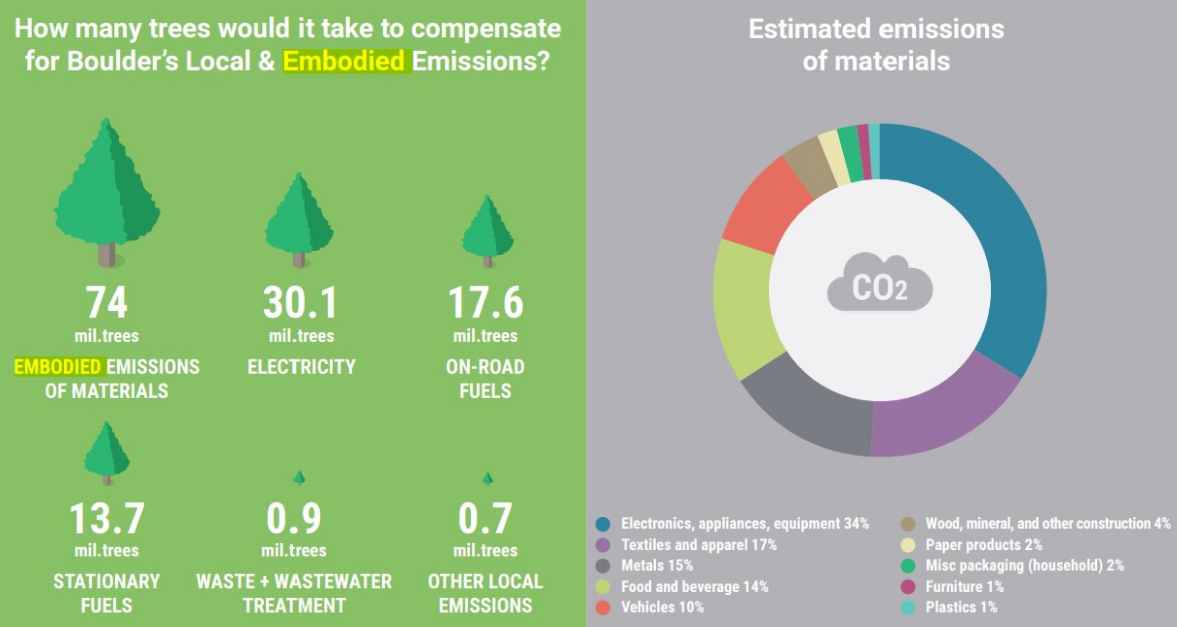 The city’s Circular Economy report shows that embodied emissions in Boulder are greater than the total of all of Boulder’s other local emissions put together – including electricity, transportation and natural gas. This means that what we buy has a bigger environmental impact than what we drive and how we power our lives.