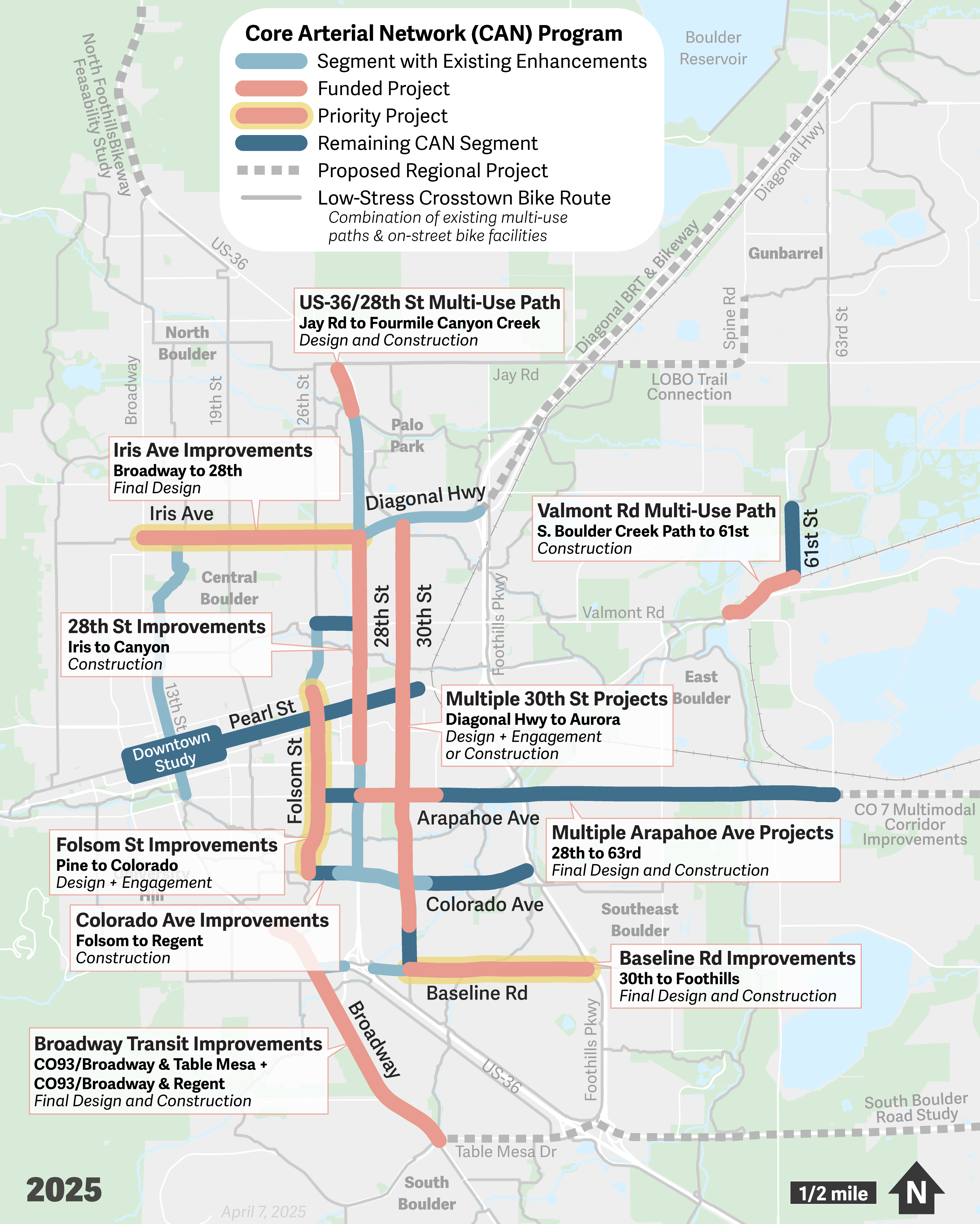 In January 2022, the Boulder City Council, in partnership with the Transportation Advisory Board (TAB), elevated work on the CAN as one of its 10 priorities for city department efforts. Since then, staff have made significant progress on the CAN initiative through successful grant applications and through planning, design, and construction of improvements to CAN corridors. City Council also reaffirmed its commitment to Vision Zero in December 2024.